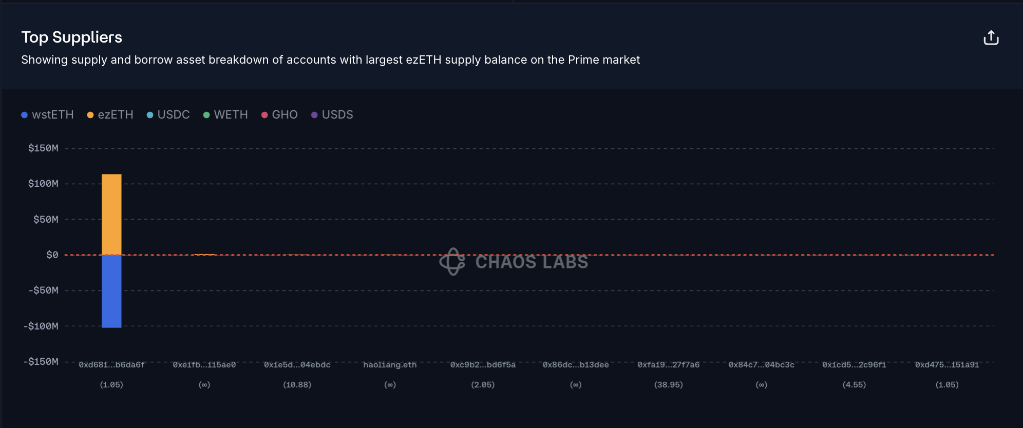Supplier concentration on Aave’s Ethereum Core market increased in October, with the largest wallet expanding its share of total ezETH deposits relative to the previous month. This top supplier now holds a significantly larger portion of total supply. The market therefore remains highly concentrated, with liquidity primarily dependent on one or two major participants. On Aave’s Ethereum Prime market supplier concentration decreased, as the largest supplier reduced its position compared to the previous month. Supplier concentration on Linea remained effectively unchanged. The same top wallets continued to dominate ezETH supply, maintaining a similar proportional distribution to the previous month. However, total supplied positions decreased slightly across the board, indicating lower aggregate participation rather than a shift in concentration.
